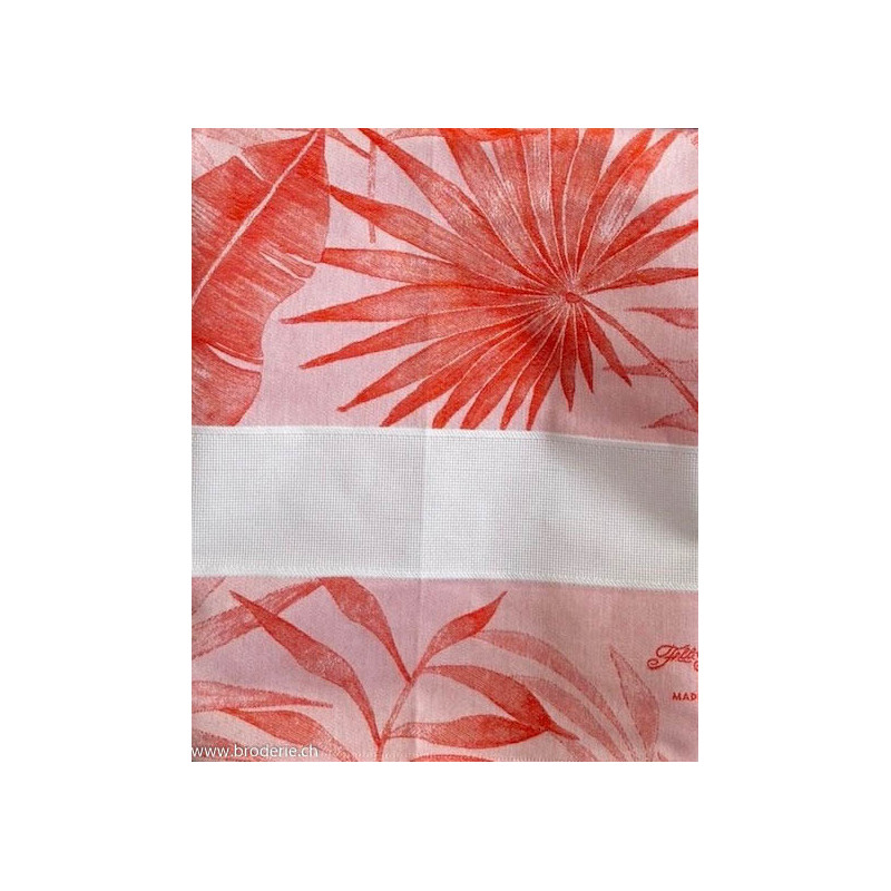 Graziano, Linge de cuisine Belize Feuilles Orange (art. CU6583). Dimensions: 60 x 75 cm. Linge mi-coton-mi-lin, fond écru, avec une bande à broder 5.5 points/cm de 50 point de haut, largeur 42cm,Référence mouliné DMC 941.