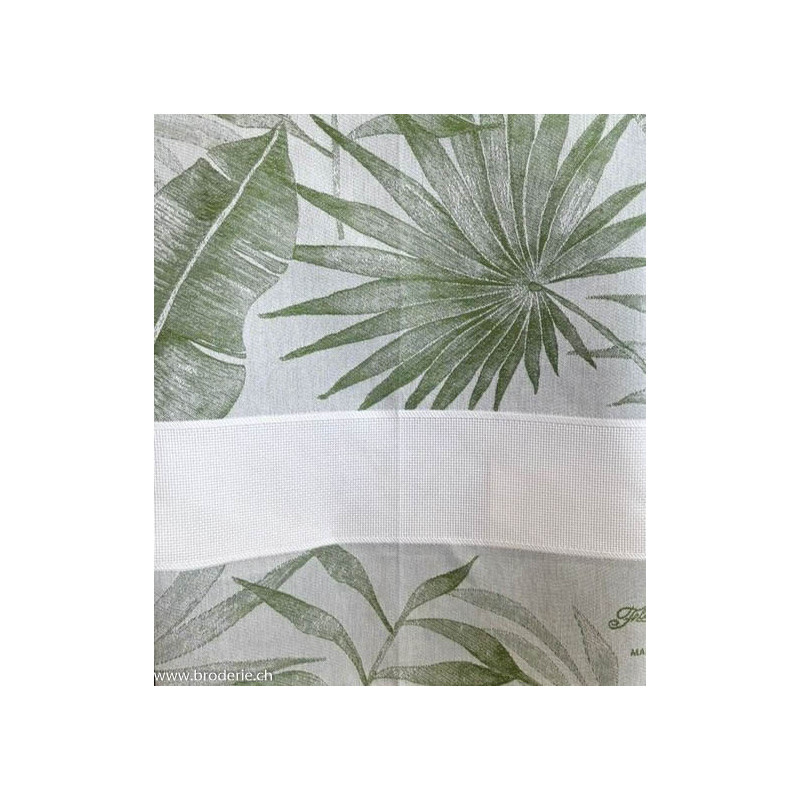 Graziano, Linge de cuisine Belize Feuilles Vert (art. CU6579). Dimensions: 60 x 75 cm. Linge mi-coton-mi-lin, fond écru, avec une bande à broder 5.5 points/cm de 50 point de haut, largeur 42cm,Référence mouliné DMC 470.