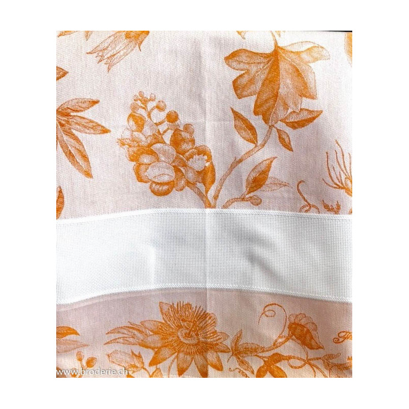 Graziano, Linge de cuisine Rio Fleurs jaune (art. CU6589). Dimensions: 60 x 75 cm. Linge mi-coton-mi-lin, fond écru, avec une bande à broder 5.5 points/cm de 50 point de haut, largeur 42cm,Référence mouliné DMC 742.