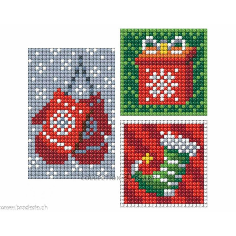 Collection d'Art, kit diamant 3 stickers Noël (art. CADEDCS016). Lot de trois kits diamants autocollants d'un format : un de 6cm sur 9cm et deux de 6cm sur 6.COmprend les toile adhésive, les strass carrés emballés dans des sachets individuels et numérotés aux références des coloris de DMC, une pince, un stylo et sa colle, et les explications.ATTENTION: ce n'est pas une broderie, il n'y a ni fil ni aiguille, mais un collage comme une mosaïque.