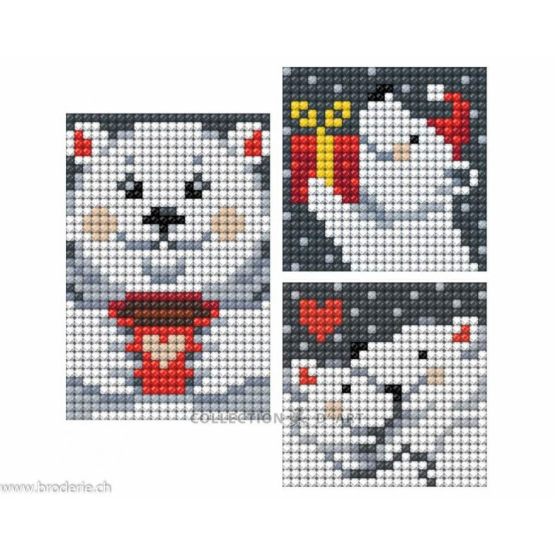 Collection d'Art, kit diamant 3 stickers Noël (art. CADEDCS017). Lot de trois kits diamants autocollants d'un format : un de 6cm sur 9cm et deux de 6cm sur 6.COmprend les toile adhésive, les strass carrés emballés dans des sachets individuels et numérotés aux références des coloris de DMC, une pince, un stylo et sa colle, et les explications.ATTENTION: ce n'est pas une broderie, il n'y a ni fil ni aiguille, mais un collage comme une mosaïque.