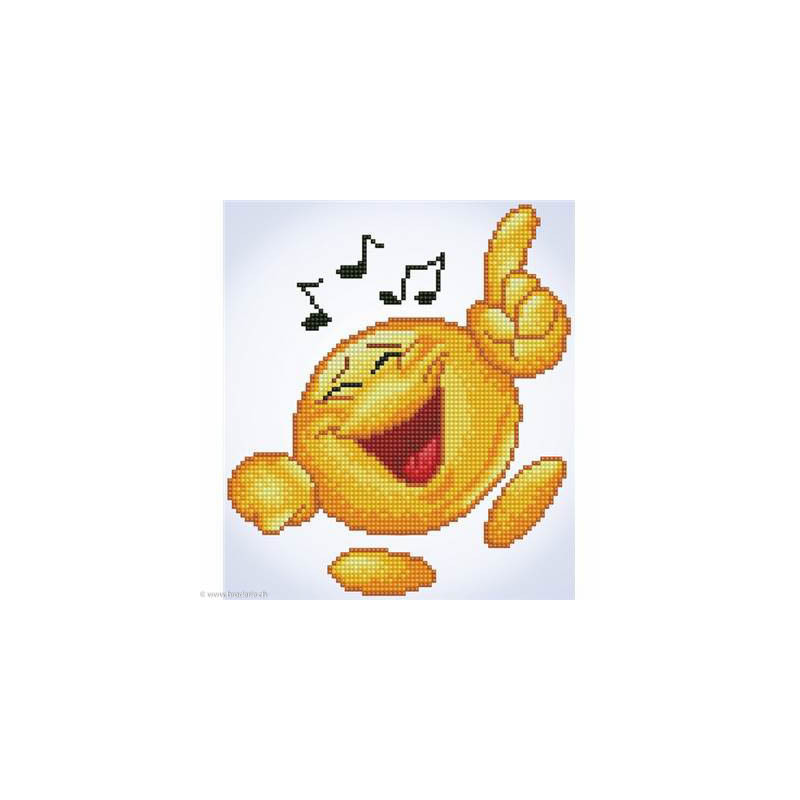 Diamond Dotz, kit diamant niveau 1 smiley musique (art. DD3020). Dimensions: 23 x 26 cm. Kit Diamant comprenant la toile adhésive imprimée à recouvrir de strass, les sachets de strass 'diamants' ronds triés par couleurs, un stylet et sa cire, un réceptacle et les explications.La toile est partiellement peinte, et n'est pas entièrement couverte de strass, uniquement les motifs qui donnent un bel aspect de relief.ATTENTION, ce n'est pas une broderie, pas de fil ni d'aiguille, mais une mosaïque.