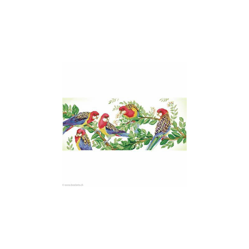 Diamond Dotz, kit diamant niveau 3- Eastern Rosella Gathering (art. DD13025). Dimensions: 87 x 37 cm. Kit Diamant comprenant la toile adhésive imprimée à recouvrir de strass, les sachets de strass 'diamants' ronds triés par couleurs, un stylet et sa cire, un réceptacle et les explications.La toile est partiellement peinte, et n'est pas entièrement couverte de strass, uniquement les motifs qui donnent un bel aspect de relief.ATTENTION, ce n'est pas une broderie, pas de fil ni d'aiguille, mais une mosaïque.