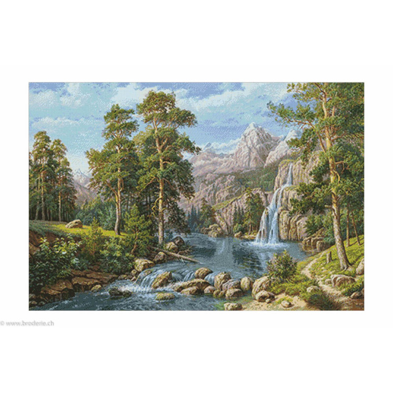 Wizardi, kit diamant Scenery with Waterfall (art. WIWD2459). Dimensions: 100 x 68 cm. Kit complet de Broderie Diamant comprenant la toile adhésive imprimée à recouvrir de strass, les sachets de strass 'diamants' triés par couleurs, un stylet et sa cire, un réceptacle et les explications. La totalité de la surface est à recouvrir. ATTENTION, ce n'est pas une broderie, pas de fil ni d'aiguille, mais une mosaïque.