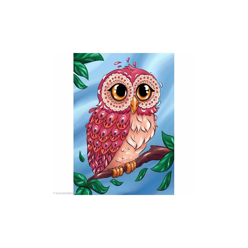 Wizardi, kit diamant Colourful Owl (art. WIWD2491). Dimensions: 27 x 38 cm. Kit complet de Broderie Diamant comprenant la toile adhésive imprimée à recouvrir de strass, les sachets de strass 'diamants' triés par couleurs, un stylet et sa cire, un réceptacle et les explications. La totalité de la surface est à recouvrir. ATTENTION, ce n'est pas une broderie, pas de fil ni d'aiguille, mais une mosaïque.chouette,rose.