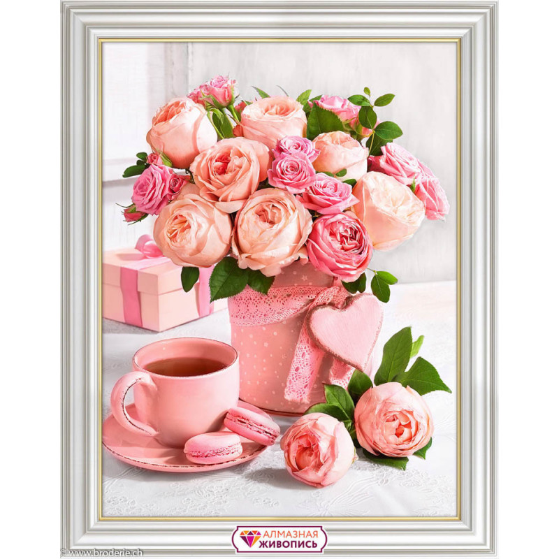 Artibalta, kit diamant Pivoines et thé (art. AZ-1883). Dimensions: 30 x 40 cm. Kit complet de Broderie Diamant comprenant la toile adhésive imprimée à recouvrir de strass, les sachets de strass 'diamants' triés par couleurs, un stylet et sa cire, un réceptacle et les explications. La totalité de la surface est à recouvrir. ATTENTION, ce n'est pas une broderie, pas de fil ni d'aiguille, mais une mosaïque.