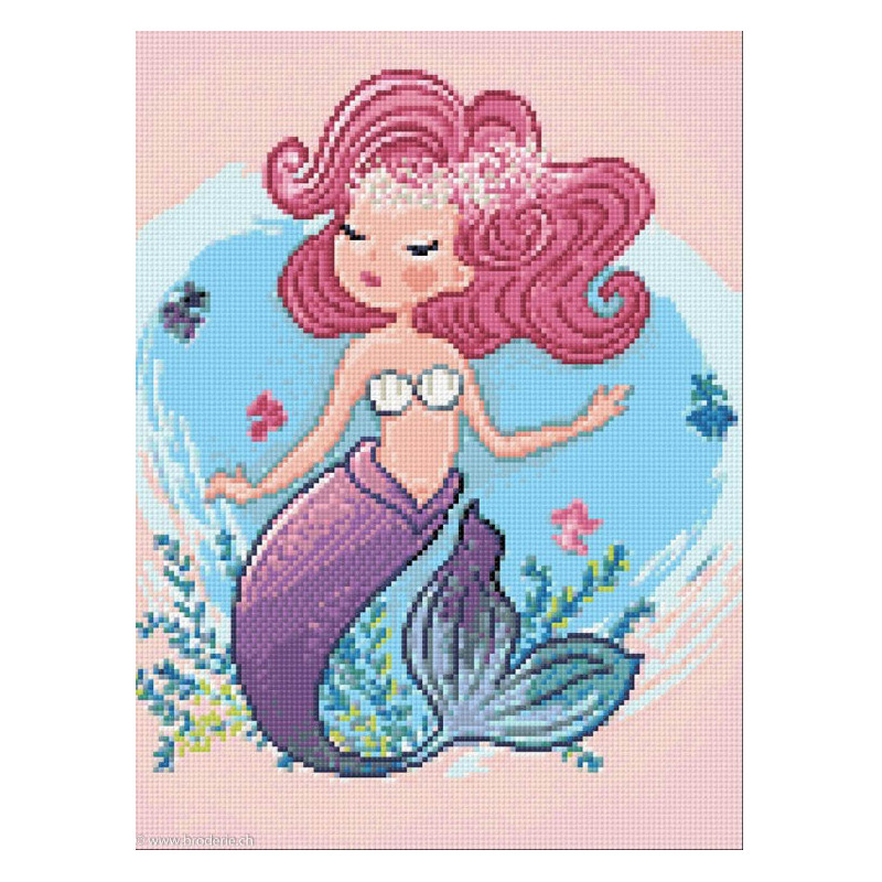 Wizardi, kit diamant The little Mermais (art. WIWD3010). Dimensions: 30 x 40 cm. Kit complet de Broderie Diamant comprenant la toile adhésive imprimée à recouvrir de strass, les sachets de strass 'diamants' triés par couleurs, un stylet et sa cire, un réceptacle et les explications. La totalité de la surface est à recouvrir. ATTENTION, ce n'est pas une broderie, pas de fil ni d'aiguille, mais une mosaïque.