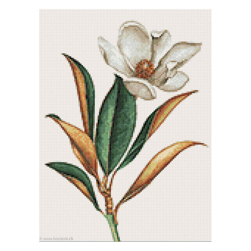 Wizardi, kit diamant Magnolia (art. WIWD3017). Dimensions: 30 x 40 cm. Kit complet de Broderie Diamant comprenant la toile adhésive imprimée à recouvrir de strass, les sachets de strass 'diamants' triés par couleurs, un stylet et sa cire, un réceptacle et les explications. La totalité de la surface est à recouvrir. ATTENTION, ce n'est pas une broderie, pas de fil ni d'aiguille, mais une mosaïque.