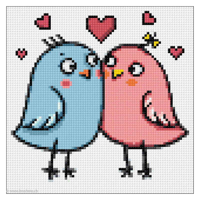 Wizardi, kit diamant Birds in love (art. WIWD3022). Dimensions: 20 x 20 cm. Kit complet de Broderie Diamant comprenant la toile adhésive imprimée à recouvrir de strass, les sachets de strass 'diamants' triés par couleurs, un stylet et sa cire, un réceptacle et les explications. La totalité de la surface est à recouvrir. ATTENTION, ce n'est pas une broderie, pas de fil ni d'aiguille, mais une mosaïque.