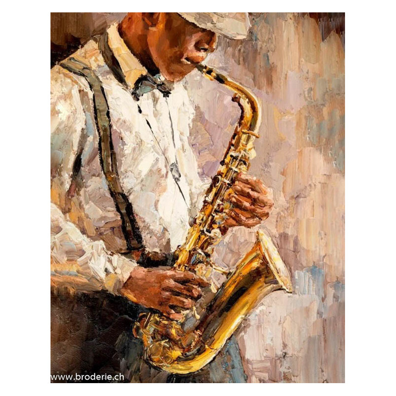 Wizardi, kit diamant The saxophone player (art. WIWD3033). Dimensions: 40 x 50 cm. Kit complet de Broderie Diamant comprenant la toile adhésive imprimée à recouvrir de strass, les sachets de strass 'diamants' triés par couleurs, un stylet et sa cire, un réceptacle et les explications. La totalité de la surface est à recouvrir. ATTENTION, ce n'est pas une broderie, pas de fil ni d'aiguille, mais une mosaïque.