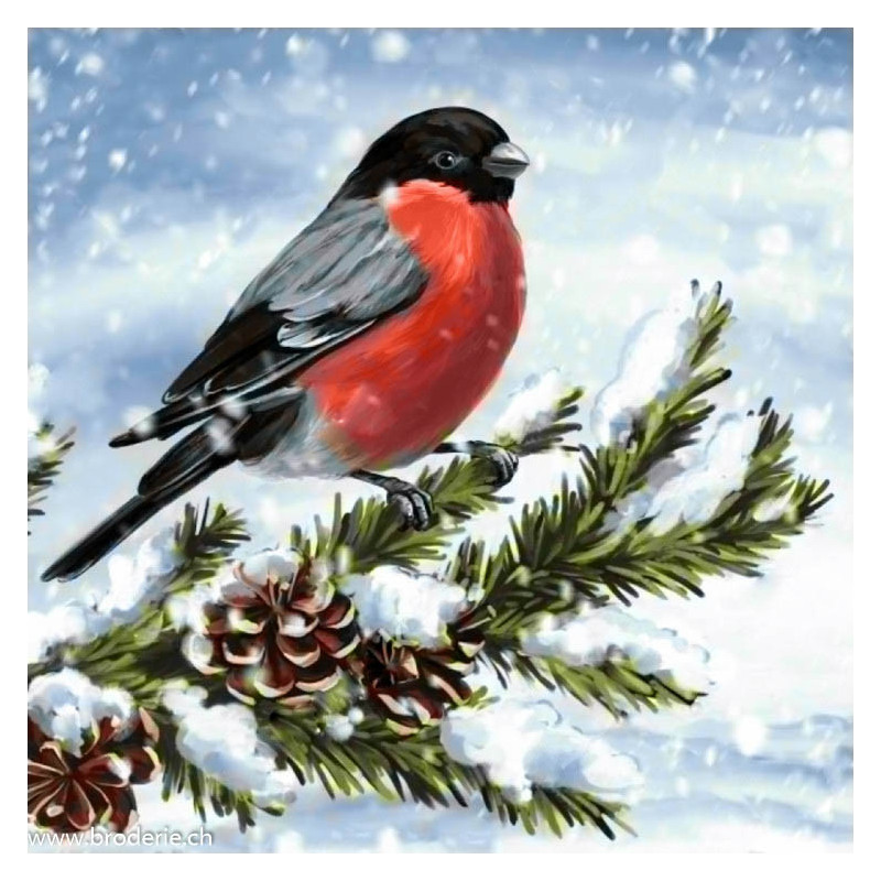Wizardi, kit diamant Bullfinch on a branch (art. WIWD3041). Dimensions: 20 x 20 cm. Kit complet de Broderie Diamant comprenant la toile adhésive imprimée à recouvrir de strass, les sachets de strass 'diamants' triés par couleurs, un stylet et sa cire, un réceptacle et les explications. La totalité de la surface est à recouvrir. ATTENTION, ce n'est pas une broderie, pas de fil ni d'aiguille, mais une mosaïque.