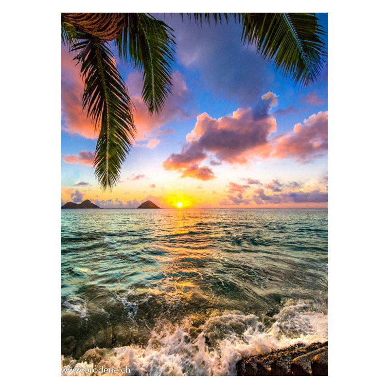 Wizardi, kit diamant Ocean sunset (art. WIWD3045). Dimensions: 30 x 40 cm. Kit complet de Broderie Diamant comprenant la toile adhésive imprimée à recouvrir de strass, les sachets de strass 'diamants' triés par couleurs, un stylet et sa cire, un réceptacle et les explications. La totalité de la surface est à recouvrir. ATTENTION, ce n'est pas une broderie, pas de fil ni d'aiguille, mais une mosaïque.