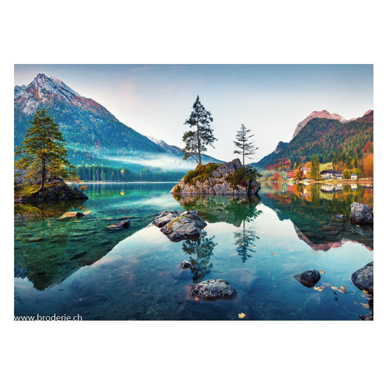 Wizardi, kit diamant Mountain lake (art. WIWD3058). Dimensions: 70 x 50 cm. Kit complet de Broderie Diamant comprenant la toile adhésive imprimée à recouvrir de strass, les sachets de strass 'diamants' triés par couleurs, un stylet et sa cire, un réceptacle et les explications. La totalité de la surface est à recouvrir. ATTENTION, ce n'est pas une broderie, pas de fil ni d'aiguille, mais une mosaïque.
