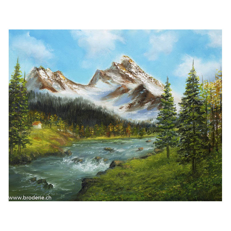 Wizardi, kit diamant Mountain River (art. WIWD3062). Dimensions: 50 x 40 cm. Kit complet de Broderie Diamant comprenant la toile adhésive imprimée à recouvrir de strass, les sachets de strass 'diamants' triés par couleurs, un stylet et sa cire, un réceptacle et les explications. La totalité de la surface est à recouvrir. ATTENTION, ce n'est pas une broderie, pas de fil ni d'aiguille, mais une mosaïque.