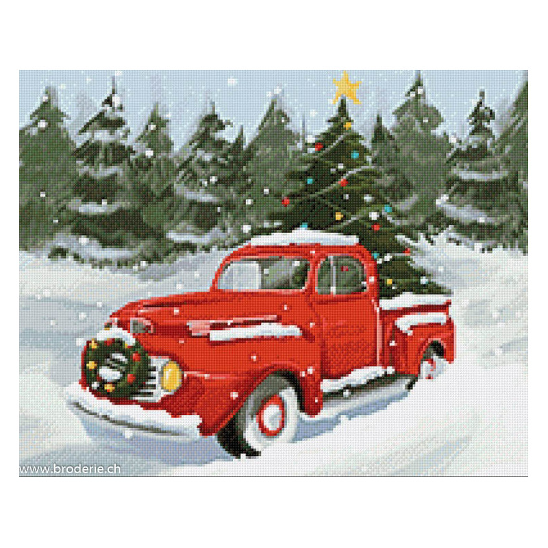 Wizardi, kit diamant Christmas Pickup (art. WIWD3064). Dimensions: 50 x 40 cm. Kit complet de Broderie Diamant comprenant la toile adhésive imprimée à recouvrir de strass, les sachets de strass 'diamants' triés par couleurs, un stylet et sa cire, un réceptacle et les explications. La totalité de la surface est à recouvrir. ATTENTION, ce n'est pas une broderie, pas de fil ni d'aiguille, mais une mosaïque.