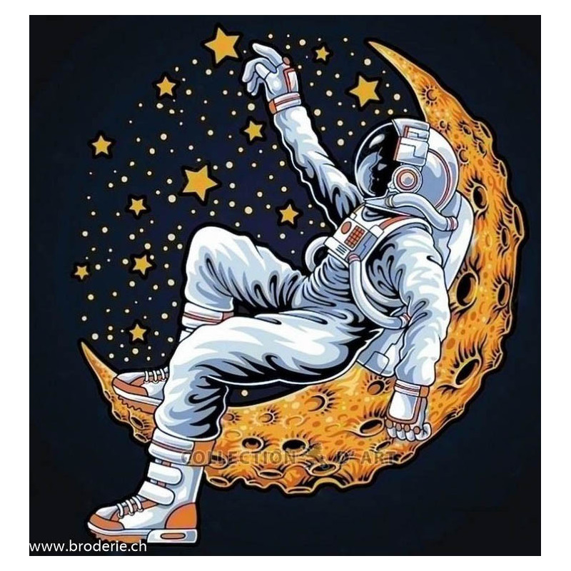 Collection d'Art, kit diamant Astronaut (art. CADE7166). Dimensions: 38 x 38 cm. Kit comprenant la toile adhésive, les strass carrés emballés dans des sachets individuels et numérotés aux références des coloris de DMC, une pince, un stylo et sa colle, 2 réceptables et les explications.Toute la surface du tableau est à recouvrir de strass. ATTENTION: ce n'est pas une broderie, il n'y a ni fil ni aiguille, mais un collage comme une mosaïque.