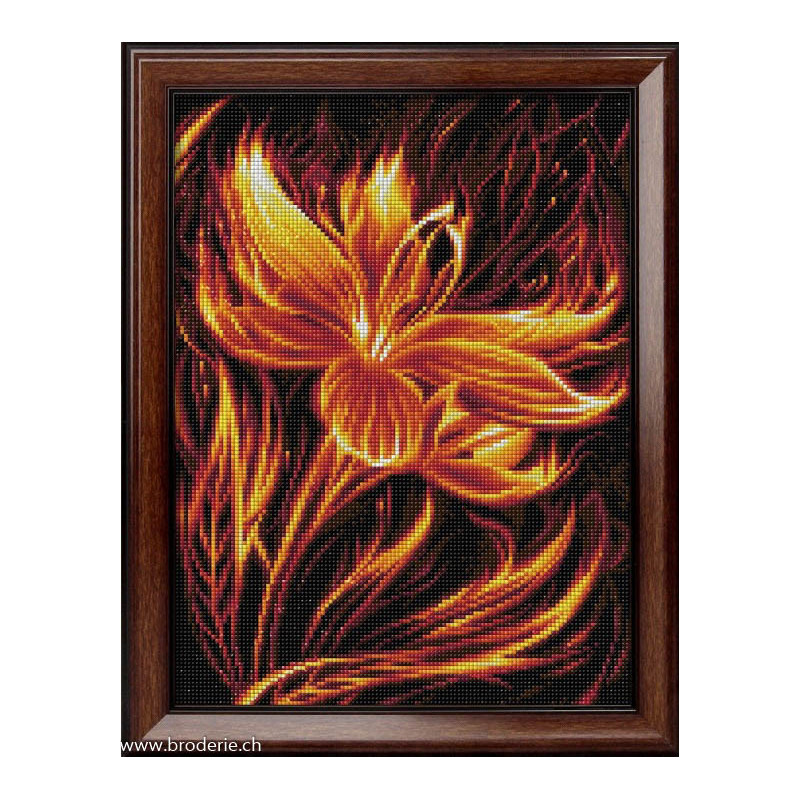 Artibalta, kit diamant Fire flower (art. AZ-1852). Dimensions: 30 x 40 cm. Kit comprenant la toile adhésive, les strass carrés emballés dans des sachets individuels et numérotés aux références des coloris de DMC, une pince, un stylo et sa colle, 2 réceptables et les explications.Toute la surface du tableau est à recouvrir de strass. ATTENTION: ce n'est pas une broderie, il n'y a ni fil ni aiguille, mais un collage comme une mosaïque.