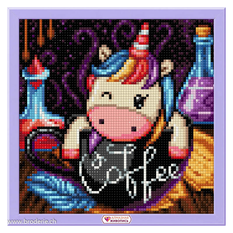 Artibalta, kit diamant Unicorn alchemist (art. AZ-1951). Dimensions: 20 x 20 cm. Kit comprenant la toile adhésive, les strass carrés emballés dans des sachets individuels et numérotés aux références des coloris de DMC, une pince, un stylo et sa colle, 2 réceptables et les explications.Toute la surface du tableau est à recouvrir de strass. ATTENTION: ce n'est pas une broderie, il n'y a ni fil ni aiguille, mais un collage comme une mosaïque.