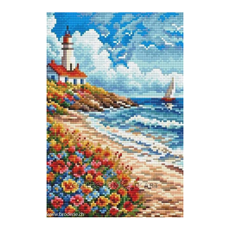 Collection d'Art, kit diamant Lighthouse on the shore (art. CADE7185). Dimensions: 20 x 30 cm. Kit comprenant la toile adhésive, les strass carrés emballés dans des sachets individuels et numérotés aux références des coloris de DMC, une pince, un stylo et sa colle, 2 réceptables et les explications.Toute la surface du tableau est à recouvrir de strass. ATTENTION: ce n'est pas une broderie, il n'y a ni fil ni aiguille, mais un collage comme une mosaïque.