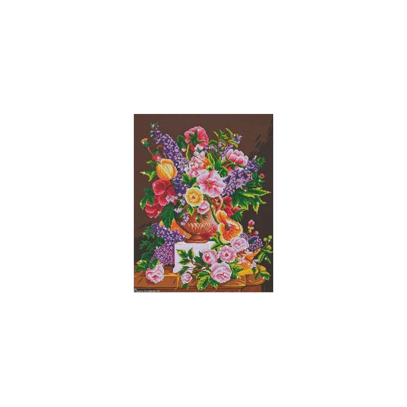 Diamond Dotz, kit diamant niveau 3- BOUQUET (art. DD12019). Dimensions: 53 x 67 cm. Kit Diamant comprenant la toile adhésive imprimée à recouvrir de strass, les sachets de strass 'diamants' ronds triés par couleurs, un stylet et sa cire, un réceptacle et les explications.La toile est partiellement peinte, et n'est pas entièrement couverte de strass, uniquement les motifs qui donnent un bel aspect de relief.ATTENTION, ce n'est pas une broderie, pas de fil ni d'aiguille, mais une mosaïque.