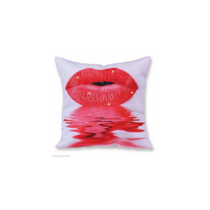 Diamond Dotz, kit diamant coussin niveau 3- LEVRES ECARLATES (art. DD16004). Dimensions: 45 x 45 cm. Kit Diamant comprenant un coussin cousu, sans rembourrage, avec la toile adhésive imprimée à recouvrir de strass, les sachets de strass 'diamants' ronds triés par couleurs, un stylet et sa cire, un réceptacle et les explications.La toile est partiellement peinte, et n'est pas entièrement couverte de strass, uniquement les motifs qui donnent un bel aspect de relief..ATTENTION, ce n'est pas une broderie, pas de fil ni d'aiguille, mais une mosaïque.