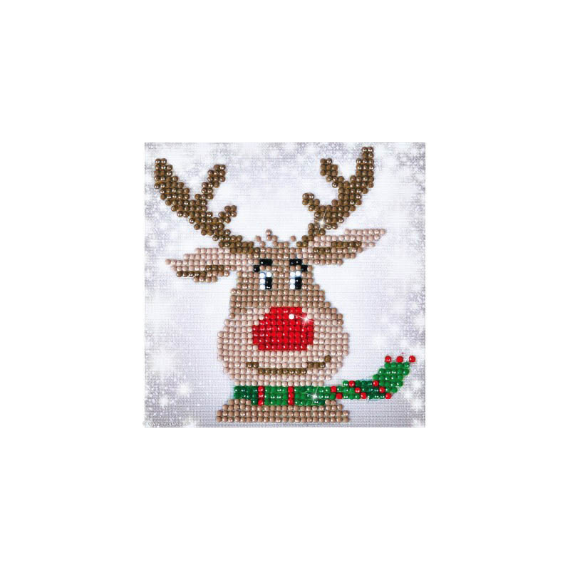 Diamond Dotz, kit diamant niveau 1 - LE RENNE (art. DD2028). Dimensions: 13.5 x 13.5 cm. Kit complet de Broderie Diamant comprenant la toile adhésive imprimée à recouvrir de strass, les sachets de strass 'diamants' ronds triés par couleurs, un stylet et sa cire, un réceptacle et les explications.La toile est partiellement peinte, et n'est pas entièrement couverte de strass, uniquement les motifs qui donnent un bel aspect de relief.ATTENTION, ce n'est pas une broderie, pas de fil ni d'aiguille, mais une mosaïque.
