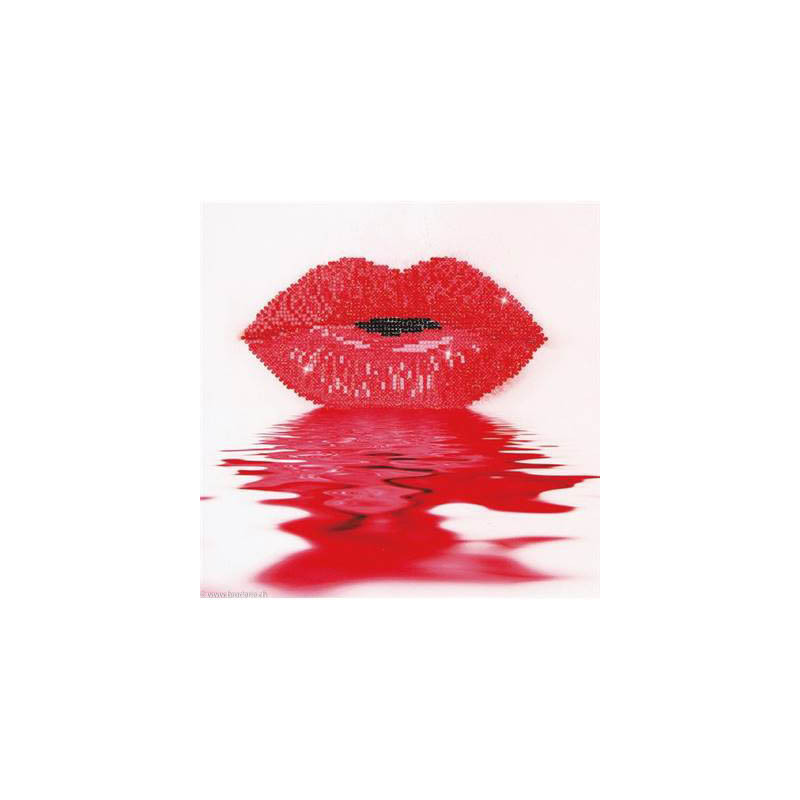 Diamond Dotz, kit diamant niveau 2- LEVRES ECARLATES (art. DD5003). Dimensions: 30 x 30 cm. Kit Diamant comprenant la toile adhésive imprimée à recouvrir de strass, les sachets de strass 'diamants' ronds triés par couleurs, un stylet et sa cire, un réceptacle et les explications.La toile est partiellement peinte, et n'est pas entièrement couverte de strass, uniquement les motifs qui donnent un bel aspect de relief.ATTENTION, ce n'est pas une broderie, pas de fil ni d'aiguille, mais une mosaïque.