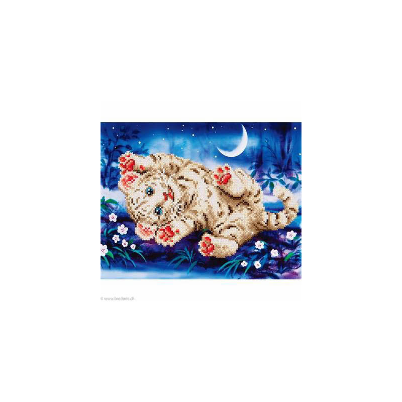 Diamond Dotz, kit diamant niveau 2- BEBE TIGRE - mars 2018 (art. DD5005). Dimensions: 35 x 28 cm. Kit Diamant comprenant la toile adhésive imprimée à recouvrir de strass, les sachets de strass 'diamants' ronds triés par couleurs, un stylet et sa cire, un réceptacle et les explications.La toile est partiellement peinte, et n'est pas entièrement couverte de strass, uniquement les motifs qui donnent un bel aspect de relief.ATTENTION, ce n'est pas une broderie, pas de fil ni d'aiguille, mais une mosaïque.