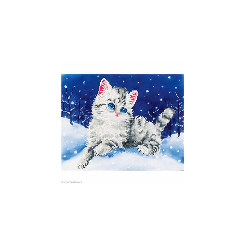 Diamond Dotz, kit diamant niveau 2- CHAT DANS LA NEIGE (art. DD5006). Dimensions: 35 x 28 cm. Kit Diamant comprenant la toile adhésive imprimée à recouvrir de strass, les sachets de strass 'diamants' ronds triés par couleurs, un stylet et sa cire, un réceptacle et les explications.La toile est partiellement peinte, et n'est pas entièrement couverte de strass, uniquement les motifs qui donnent un bel aspect de relief.ATTENTION, ce n'est pas une broderie, pas de fil ni d'aiguille, mais une mosaïque.