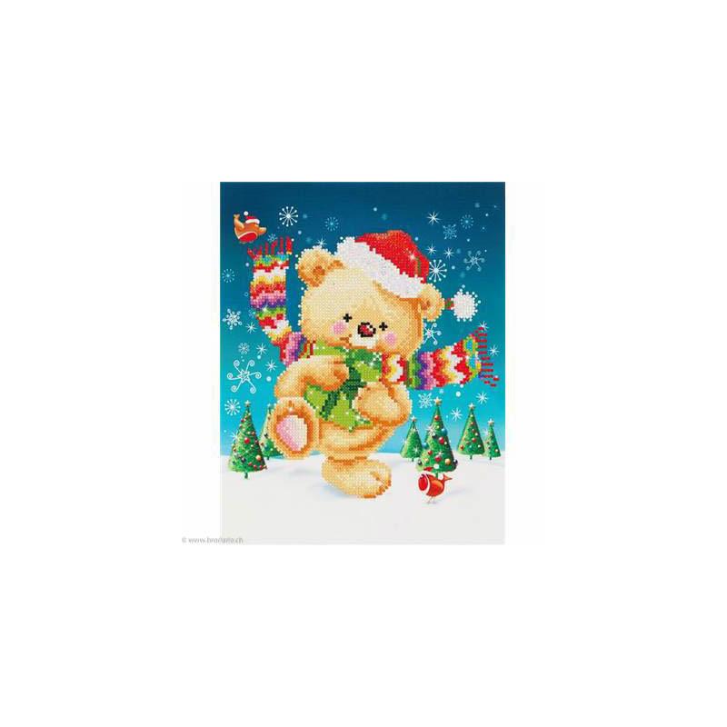 Diamond Dotz, kit diamant niveau 2- OURS DE NOEL (art. DD5013). Dimensions: 27 x 35 cm. Kit Diamant comprenant la toile adhésive imprimée à recouvrir de strass, les sachets de strass 'diamants' ronds triés par couleurs, un stylet et sa cire, un réceptacle et les explications.La toile est partiellement peinte, et n'est pas entièrement couverte de strass, uniquement les motifs qui donnent un bel aspect de relief.ATTENTION, ce n'est pas une broderie, pas de fil ni d'aiguille, mais une mosaïque.