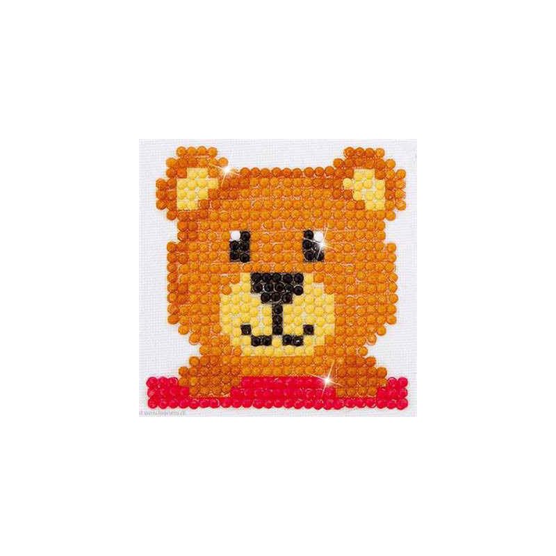 Diamond Dotz, kit diamant niveau 1- NOUNOURS (art. DDS001). Dimensions: 7 x 7 cm. Kit complet de Broderie Diamant comprenant la toile adhésive imprimée à recouvrir de strass, les sachets de strass 'diamants' ronds triés par couleurs, un stylet et sa cire, un réceptacle et les explications.La toile est partiellement peinte, et n'est pas entièrement couverte de strass, uniquement les motifs qui donnent un bel aspect de relief.ATTENTION, ce n'est pas une broderie, pas de fil ni d'aiguille, mais une mosaïque.