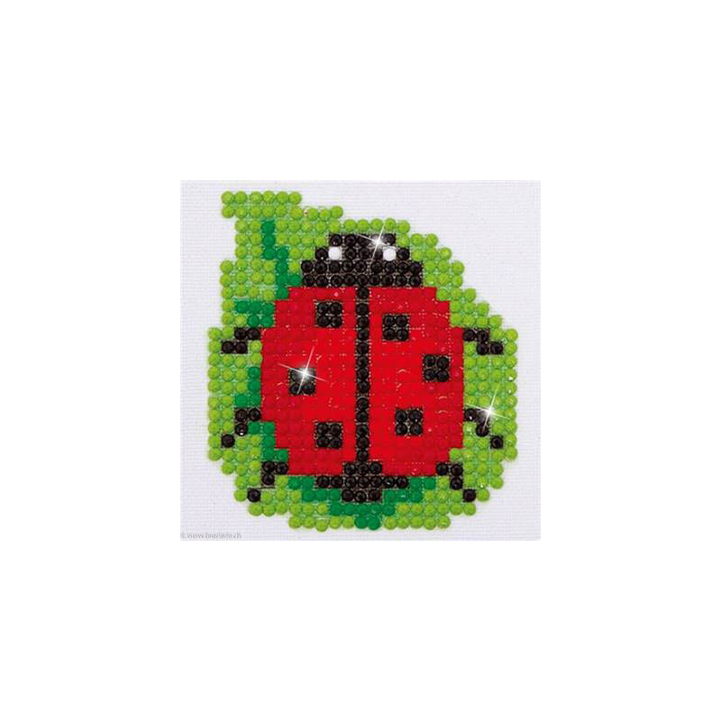 Diamond Dotz, kit diamant niveau 1 - COCCINELLE (art. DDS008). Dimensions: 7 x 7 cm. Kit complet de Broderie Diamant comprenant la toile adhésive imprimée à recouvrir de strass, les sachets de strass 'diamants' ronds triés par couleurs, un stylet et sa cire, un réceptacle et les explications.La toile est partiellement peinte, et n'est pas entièrement couverte de strass, uniquement les motifs qui donnent un bel aspect de relief.ATTENTION, ce n'est pas une broderie, pas de fil ni d'aiguille, mais une mosaïque.