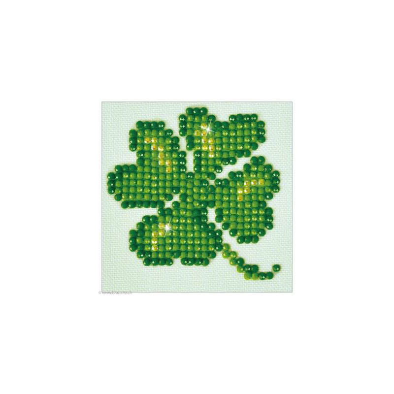 Diamond Dotz, kit diamant niveau 1- LE TREFLE PORTE BONHEUR (art. DDS011). Dimensions: 7 x 7 cm. Kit complet de Broderie Diamant comprenant la toile adhésive imprimée à recouvrir de strass, les sachets de strass 'diamants' ronds triés par couleurs, un stylet et sa cire, un réceptacle et les explications.La toile est partiellement peinte, et n'est pas entièrement couverte de strass, uniquement les motifs qui donnent un bel aspect de relief.ATTENTION, ce n'est pas une broderie, pas de fil ni d'aiguille, mais une mosaïque.