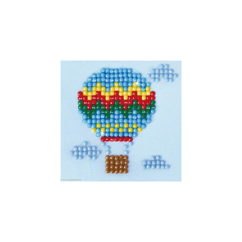 Diamond Dotz, kit diamant niveau 1- LA MONTGOLFIERE (art. DDS013). Dimensions: 7 x 7 cm. Kit complet de Broderie Diamant comprenant la toile adhésive imprimée à recouvrir de strass, les sachets de strass 'diamants' ronds triés par couleurs, un stylet et sa cire, un réceptacle et les explications.La toile est partiellement peinte, et n'est pas entièrement couverte de strass, uniquement les motifs qui donnent un bel aspect de relief.ATTENTION, ce n'est pas une broderie, pas de fil ni d'aiguille, mais une mosaïque.