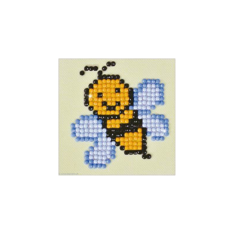 Diamond Dotz, kit diamant niveau 1- L' ABEILLE (art. DDS015). Dimensions: 7 x 7 cm. Kit complet de Broderie Diamant comprenant la toile adhésive imprimée à recouvrir de strass, les sachets de strass 'diamants' ronds triés par couleurs, un stylet et sa cire, un réceptacle et les explications.La toile est partiellement peinte, et n'est pas entièrement couverte de strass, uniquement les motifs qui donnent un bel aspect de relief.ATTENTION, ce n'est pas une broderie, pas de fil ni d'aiguille, mais une mosaïque.