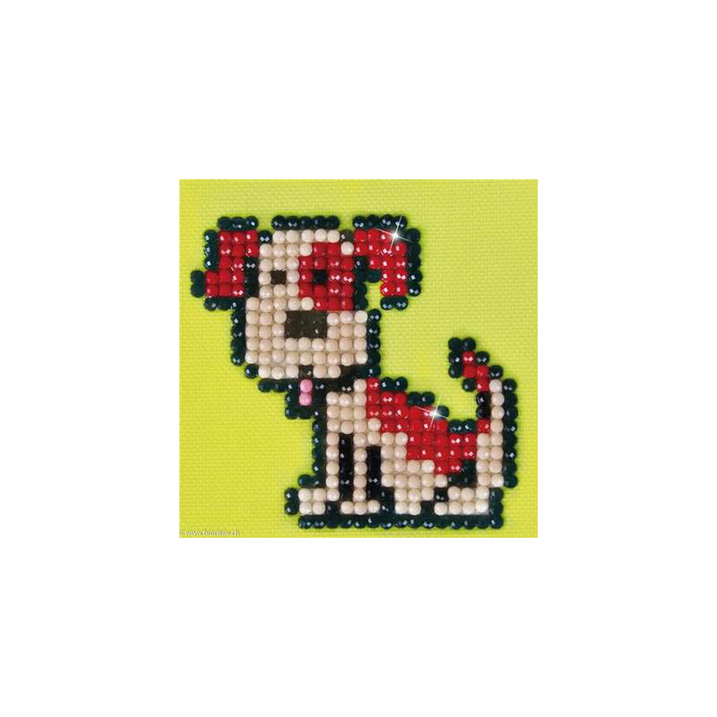 Diamond Dotz, kit diamant niveau 1- LE PETIT CHIEN (art. DDS018). Dimensions: 7 x 7 cm. Kit complet de Broderie Diamant comprenant la toile adhésive imprimée à recouvrir de strass, les sachets de strass 'diamants' ronds triés par couleurs, un stylet et sa cire, un réceptacle et les explications.La toile est partiellement peinte, et n'est pas entièrement couverte de strass, uniquement les motifs qui donnent un bel aspect de relief.ATTENTION, ce n'est pas une broderie, pas de fil ni d'aiguille, mais une mosaïque.