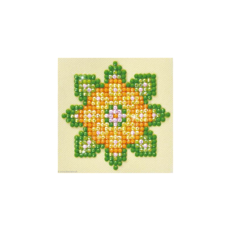 Diamond Dotz, kit diamant niveau 1- MANDALA FLEUR 1 (art. DDS029). Dimensions: 7 x 7 cm. Kit complet de Broderie Diamant comprenant la toile adhésive imprimée à recouvrir de strass, les sachets de strass 'diamants' ronds triés par couleurs, un stylet et sa cire, un réceptacle et les explications.La toile est partiellement peinte, et n'est pas entièrement couverte de strass, uniquement les motifs qui donnent un bel aspect de relief.ATTENTION, ce n'est pas une broderie, pas de fil ni d'aiguille, mais une mosaïque.