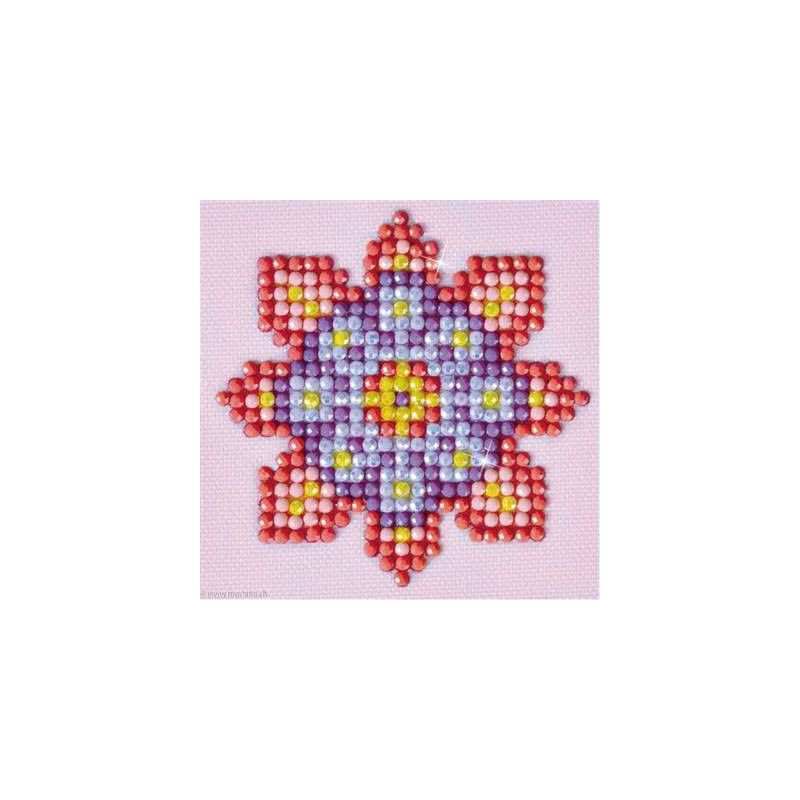 Diamond Dotz, kit diamant niveau 1- MANDALA FLEUR 2 (art. DDS030). Dimensions: 7 x 7 cm. Kit complet de Broderie Diamant comprenant la toile adhésive imprimée à recouvrir de strass, les sachets de strass 'diamants' ronds triés par couleurs, un stylet et sa cire, un réceptacle et les explications.La toile est partiellement peinte, et n'est pas entièrement couverte de strass, uniquement les motifs qui donnent un bel aspect de relief.ATTENTION, ce n'est pas une broderie, pas de fil ni d'aiguille, mais une mosaïque.