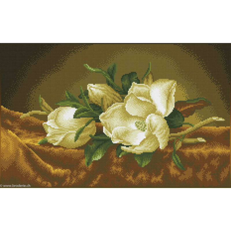 Diamond Dotz, kit diamant niveau 2 Magnolias, J Heade (art. DD12046). Dimensions: 66 x 41 cm. Kit Diamant comprenant la toile adhésive imprimée à recouvrir de strass, les sachets de strass 'diamants' ronds triés par couleurs, un stylet et sa cire, un réceptacle et les explications.La toile est entièrement couverte de strass.ATTENTION, ce n'est pas une broderie, pas de fil ni d'aiguille, mais une mosaïque.
