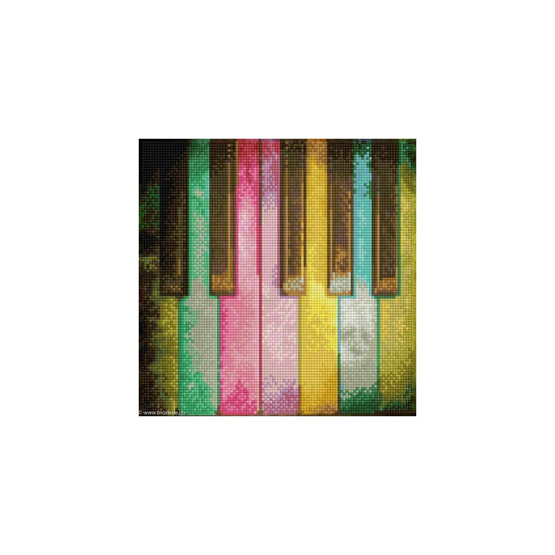 Diamond Dotz, kit diamant niveau 2 Piano Rainbow (art. DD5068). Dimensions: 30 x 30 cm. Kit Diamant comprenant la toile adhésive imprimée à recouvrir de strass, les sachets de strass 'diamants' ronds triés par couleurs, un stylet et sa cire, un réceptacle et les explications.La toile entièrement recouverte de strass.ATTENTION, ce n'est pas une broderie, pas de fil ni d'aiguille, mais une mosaïque.