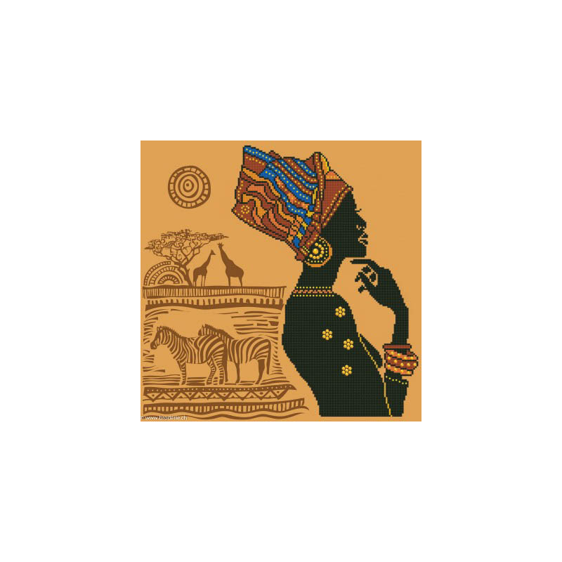 Diamond Dotz, kit diamant niveau 2 African Elegance (art. DD9029). Dimensions: 49 x 49 cm. Kit Diamant comprenant la toile adhésive imprimée à recouvrir de strass, les sachets de strass 'diamants' ronds triés par couleurs, un stylet et sa cire, un réceptacle et les explications.La toile est partiellement peinte, et n'est pas entièrement couverte de strass, uniquement les motifs qui donnent un bel aspect de relief.ATTENTION, ce n'est pas une broderie, pas de fil ni d'aiguille, mais une mosaïque.