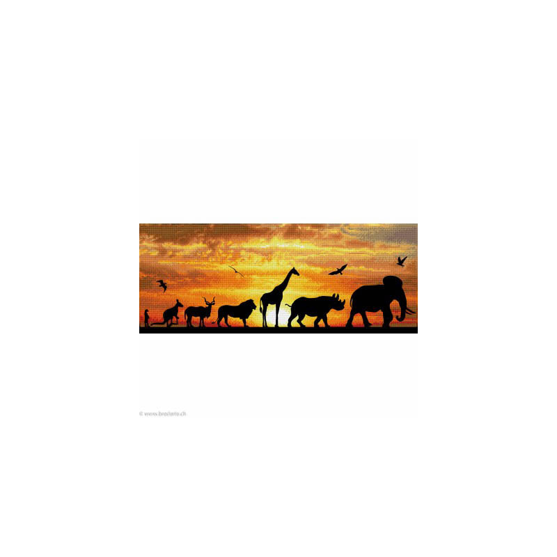Diamond Dotz, kit diamant niveau 2 African Sky (art. DD9055). Dimensions: 72 x 22.5 cm. Kit Diamant comprenant la toile adhésive imprimée à recouvrir de strass, les sachets de strass 'diamants' ronds triés par couleurs, un stylet et sa cire, un réceptacle et les explications.La toile est partiellement peinte, et n'est pas entièrement couverte de strass, uniquement les motifs qui donnent un bel aspect de relief. Dans ce kit les animaux ne sont pas recouvert de strass, mais le ciel.ATTENTION, ce n'est pas une broderie, pas de fil ni d'aiguille, mais une mosaïque.
