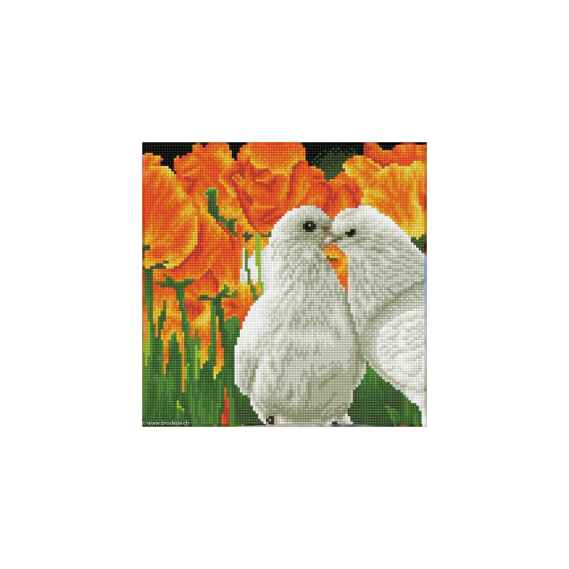 Diamond Dotz, kit diamant niveau 2 Kissing Doves (art. DD5077). Dimensions: 30.5 x 30.5 cm. Kit Diamant comprenant la toile adhésive imprimée à recouvrir de strass, les sachets de strass 'diamants' ronds triés par couleurs, un stylet et sa cire, un réceptacle et les explications.La toile est entièrement recouverte de strass. ATTENTION, ce n'est pas une broderie, pas de fil ni d'aiguille, mais une mosaïque.
