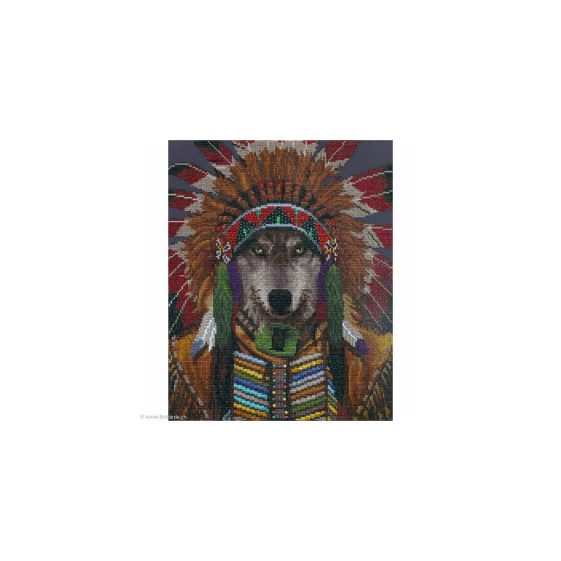 Diamond Dotz, kit diamant niveau 2 Wolf Spirit Chief (art. DD10053). Dimensions: 50 x 40 cm. Kit Diamant comprenant la toile adhésive imprimée à recouvrir de strass, les sachets de strass 'diamants' ronds triés par couleurs, un stylet et sa cire, un réceptacle et les explications.La toile est partiellement peinte, et n'est pas entièrement couverte de strass, uniquement les motifs qui donnent un bel aspect de relief.ATTENTION, ce n'est pas une broderie, pas de fil ni d'aiguille, mais une mosaïque.