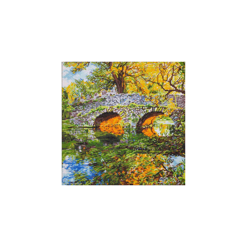 Diamond Dotz, kit diamant niveau 2 Country Bridge (art. DD12059). Dimensions: 51.5 x 51.5 cm. Kit Diamant comprenant la toile adhésive imprimée à recouvrir de strass, les sachets de strass 'diamants' ronds triés par couleurs, un stylet et sa cire, un réceptacle et les explications.La toile est entièrement recouverte de strass. ATTENTION, ce n'est pas une broderie, pas de fil ni d'aiguille, mais une mosaïque.