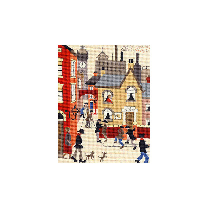 Bothy Threads, kit canevas peint The Cheese (art. BOTLC11). Dimensions: 25 x 31 cm. Points utilisés: point de croix. Demi points sur canevas peint de 4 ou 5 points/cm, avec laines Anchor. dans la même série TLC et numéro. Modèle de L.S.Lowry.