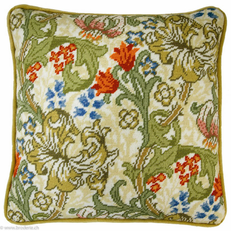 Bothy Threads, kit Canevas peint Golden Lily (art. BOTAC9). Dimensions: 35 x 35 cm. Demi points sur canevas peint en couleur de 4 points/cm, dans la même série BOTAC et numéro, modèle de walter Crane, avec laines Anchor.