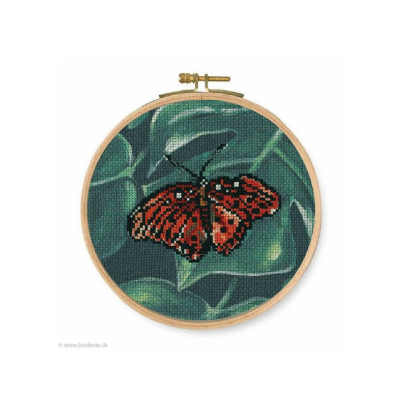 DMC, kit Sous les Tropiques - Papillon rouge (art. DMC-BK1788). Dimensions: 15.5 x 15.5 cm. Trame colorée pour le fond, mais le motif est à broder au point de croix comptés. Aïda 5.5 points/cm, dans la même série BK1789, BK1790, BK1791, tambour inclus.
