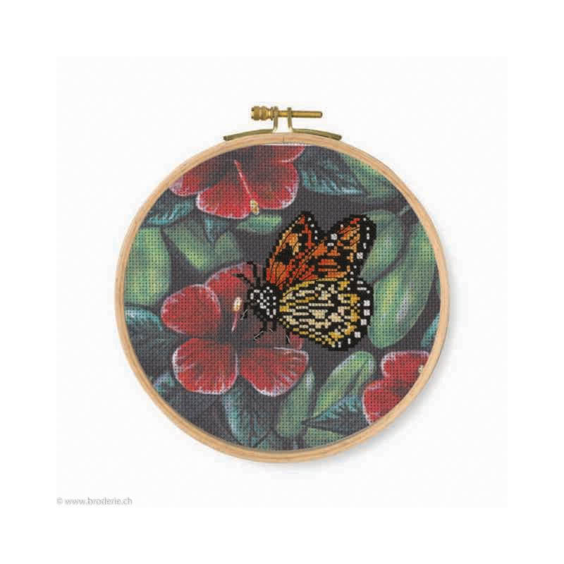 DMC, kit Sous les Tropiques - Papillon orange (art. DMC-BK1789). Dimensions: 15.5 x 15.5 cm. Trame colorée pour le fond, mais le motif est à broder au point de croix comptés. Aïda 5.5 points/cm, dans la même série BK1788, BK1790, BK1791, tambour inclus.