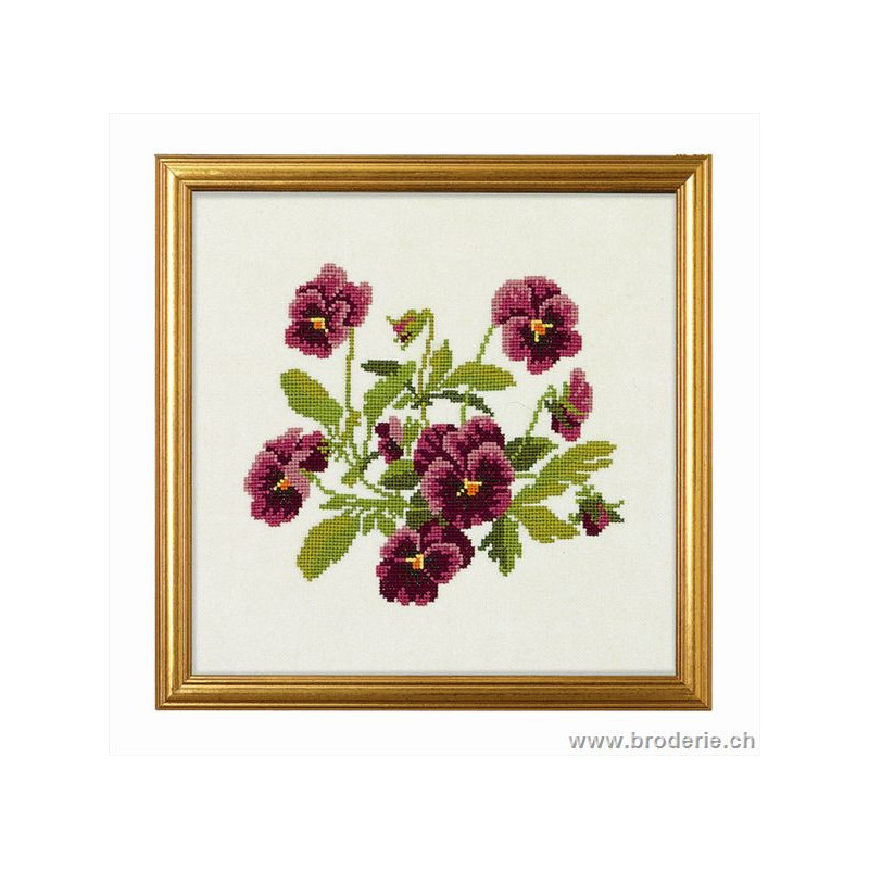 L'article 'Eva Rosenstand, kit Pensées violettes (EV08-4486)' fait partie de notre assortiment depuis le 1 mai 2009. Eva Rosenstand est une très belle gamme de points de croix comptés qui fête en 2008 ses 50 ans d'existence. Eva Rosenstand est une des premières maisons à avoir proposé aux clientes un style de broderie qui offrait d'autres motifs que des abécédaires ou marquoirs ... Les créatrices Clara Waever et Eva Rosenstand ont innové en réalisant de véritables tableaux en points de croix comptés, à s'y méprendre à de véritables peintures si on se tient à 1 petit mètre. Vous trouverez dans la gamme Eva Rosenstand beaucoup de paysages, des animaux qui semblent réels et pleins d'autres thèmes (mer - le Cervin - anciens métiers ... cartes de géographie des pays européens). Fiche technique : très belles broderies, riches en teintes différentes, souvent réalisées sur du lin. Points de croix comptés, points arrières. Ces ouvrages ne sont pas difficiles, mais relativement longs - regardez bien le format avant de commander et il est préférable d'aimer travailler sur du lin .. car c'est un peu dommage de devoir changer la trame.